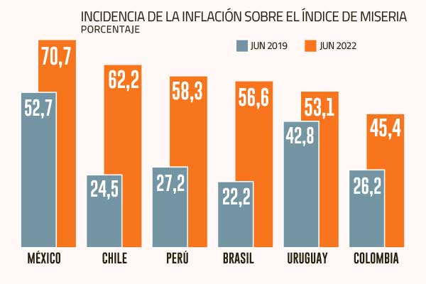 - Le Chili est le pays latinoaméricain où a le plus monté l'indice de misère depuis 2020 (en proportion), alors que l'an passé il était encore leader en développement humain selon l'ONU. (Graphique)